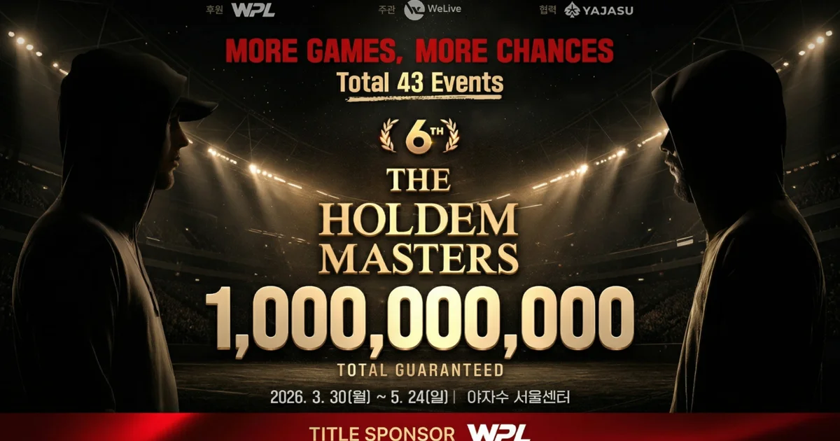 WPL(Winjoy Poker League) 타이틀 스폰서의 제6회 홀덤 마스터스(The Holdem Masters)가 2026년 3월 30일부터 5월 24일까지 야자수 서울센터를 중심으로 개최된다. 주관사 WeLive와 협력사 야자수(YAJASU)가 함께하는 이번 대회는 총 43개 이벤트, 보장 상금 10억 코인이라는 국내 홀덤 시리즈 중에서도 손꼽히는 규모로 편성되었다. 약 두 달간 이어지는 장기 시리즈인 만큼, 참가 전략을 세우려면 전체 구조부터 파악하는 것이 중요하다.